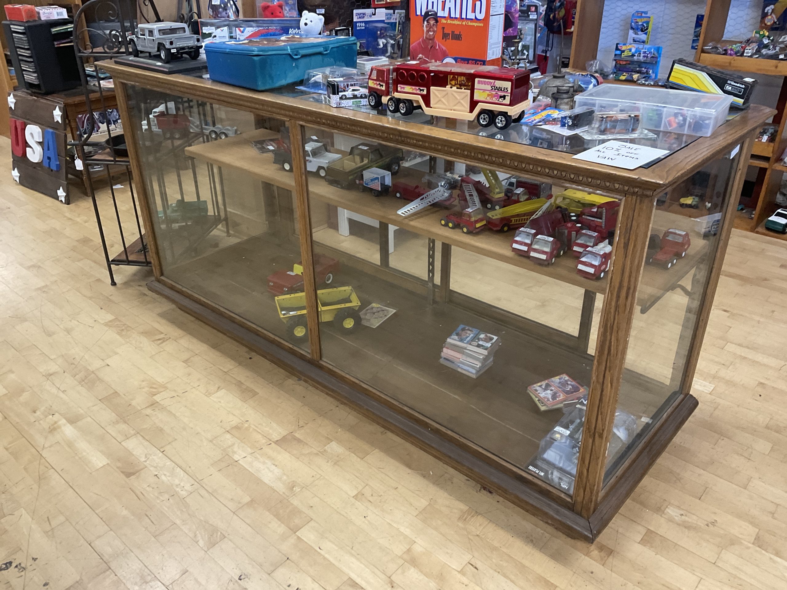 Antique oak and glass display case. Glass top and glass/oak rear sliding doors. They are lockable but key is missing. There is one adjustable shelf and more could be added.