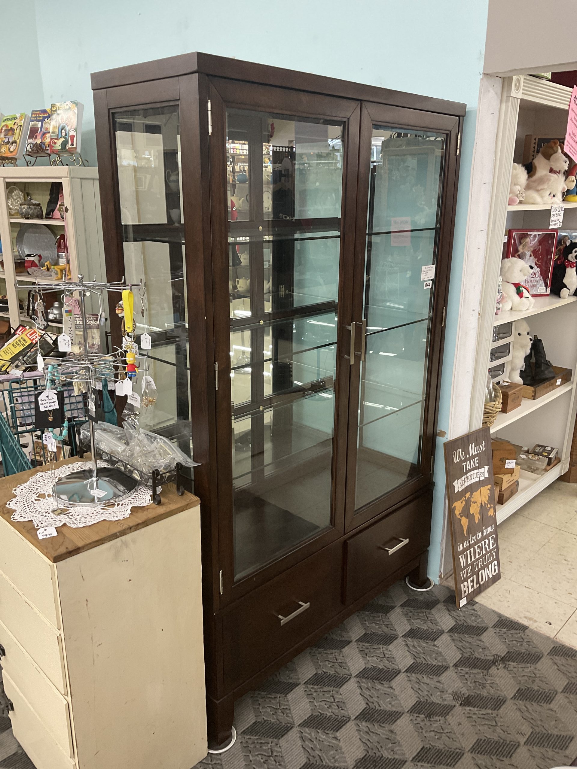 Contemporary dark wood display case. Case has two large drawers on the bottom, three adjustable glass shelves and is lighted. Case is lockable with additional equipment not included.