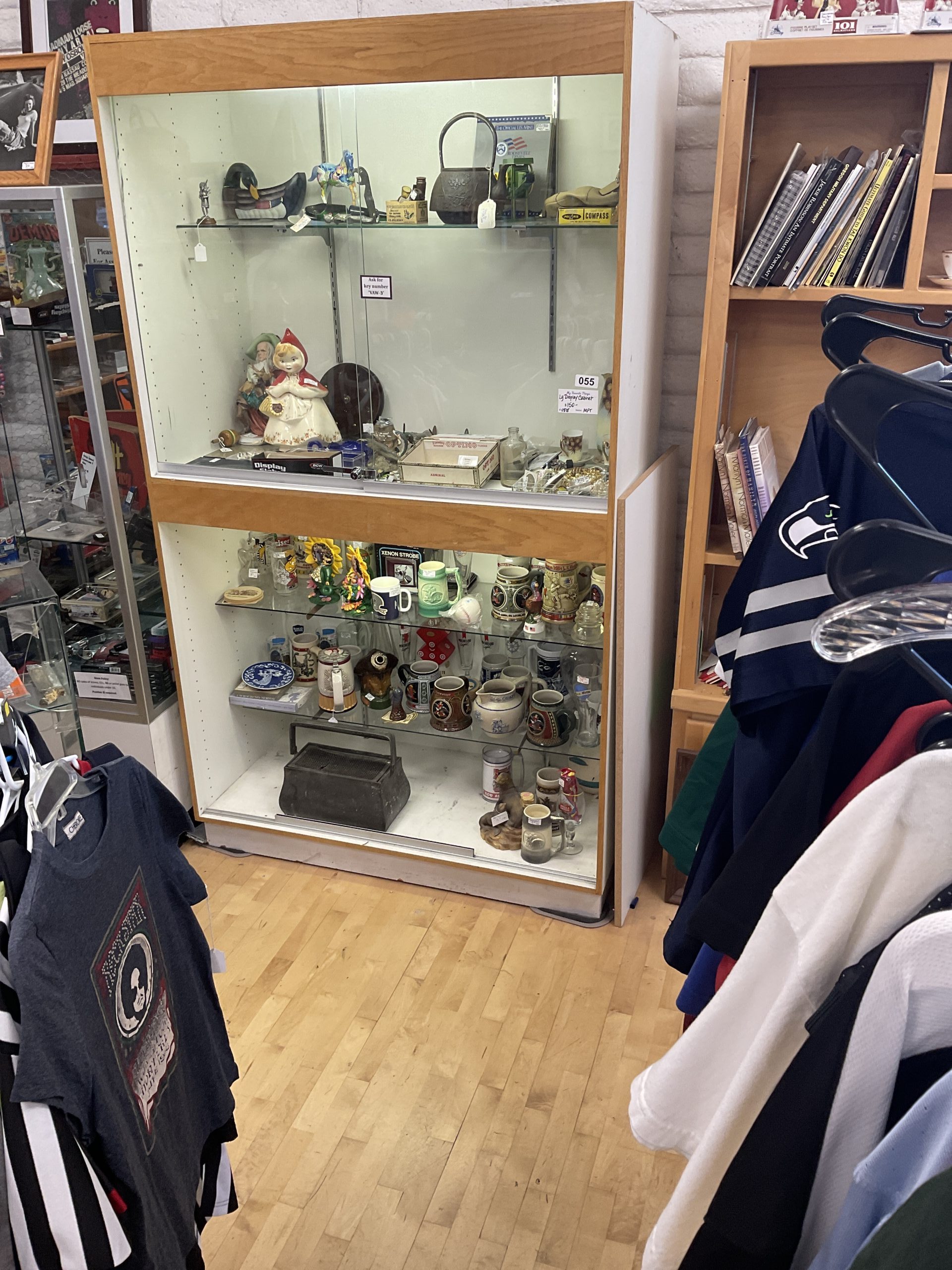 Laminate veneer particle board display case. Lighted case with upper half has glass sliding doors that are lockable and one adjustable glass shelf (room for more) Lower cabinet is missing glass sliding doors and there are two adjustable glass shelves.
