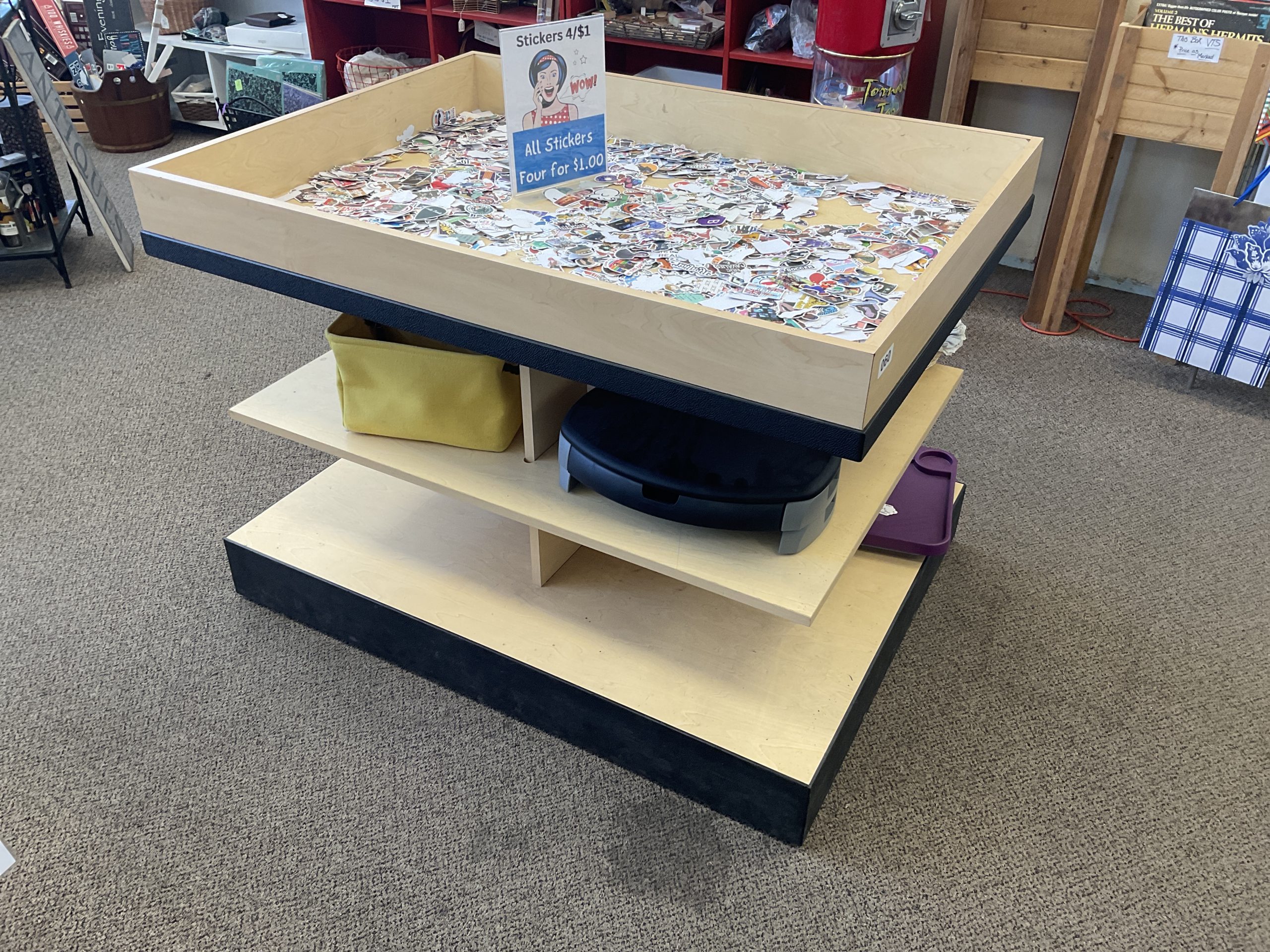 Retail dump bins display on wheels. Useful for displaying bulk items. There is a lower shelf that can be removed.