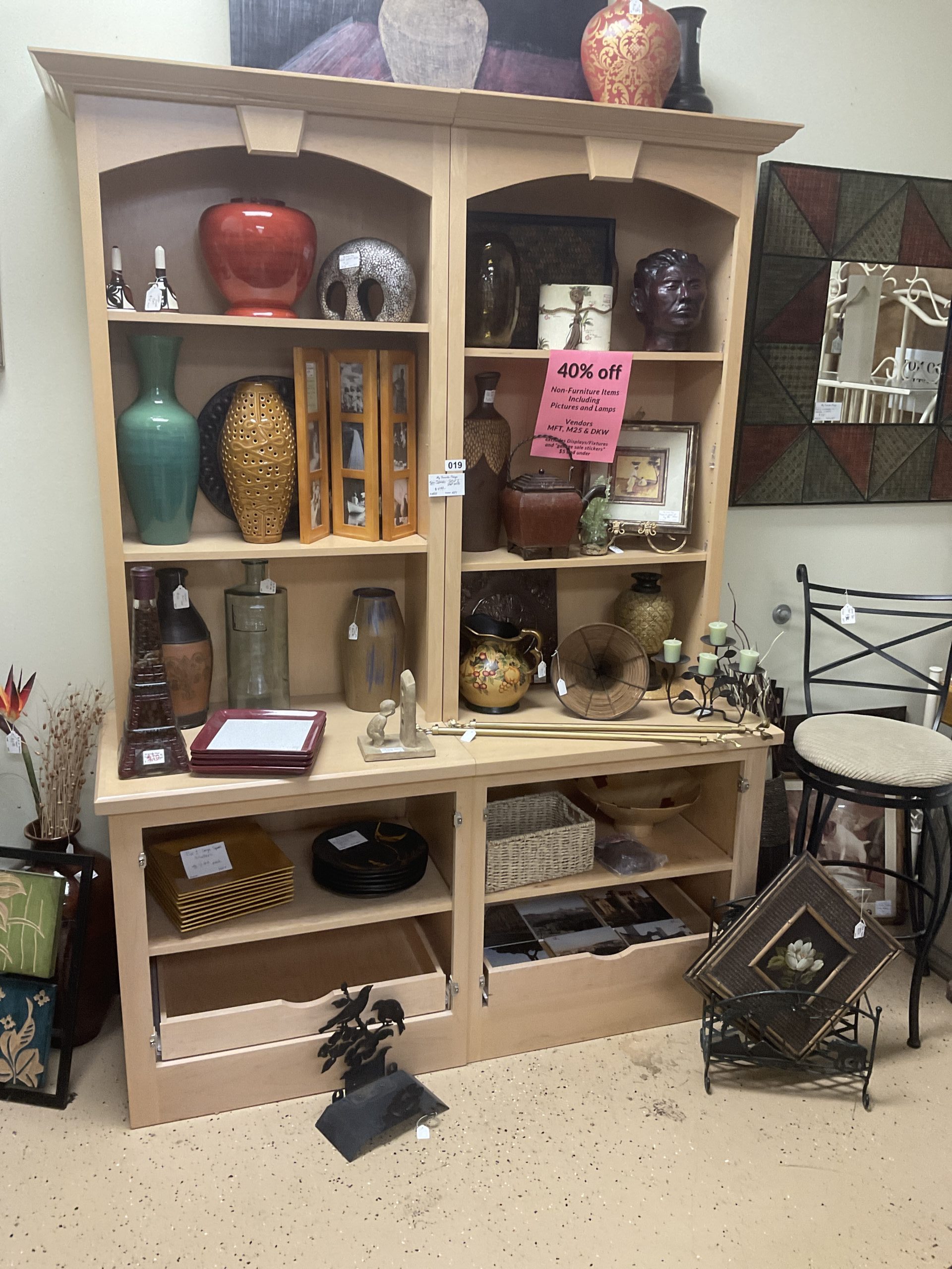 Twin hutch cabinets with four adjustable wood shelves. Bottom cabinets each have a drawer and a shelf. The doors for the bottom cabinets will be reinstalled. They were removed to increase display area.