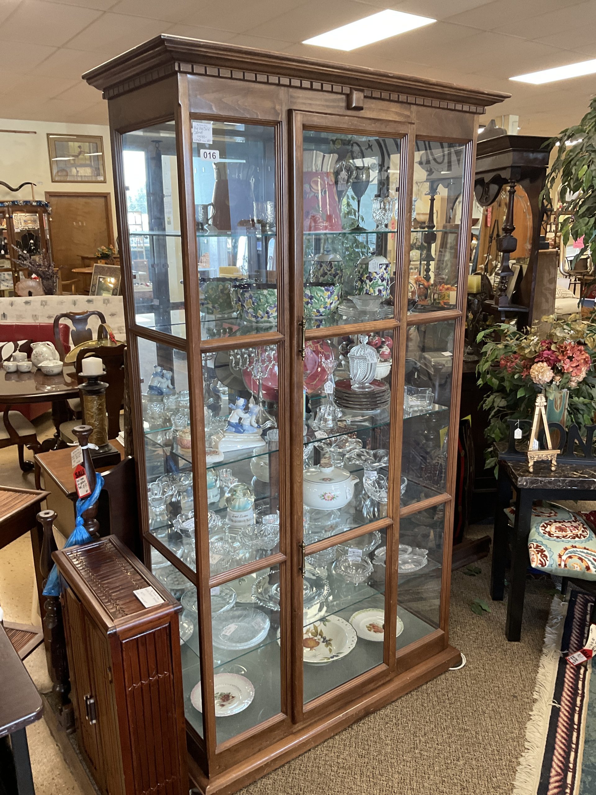 Vintage lighted glass and wood display case. Front door entry, no lock without modification. Five non-adjustable glass shelves.