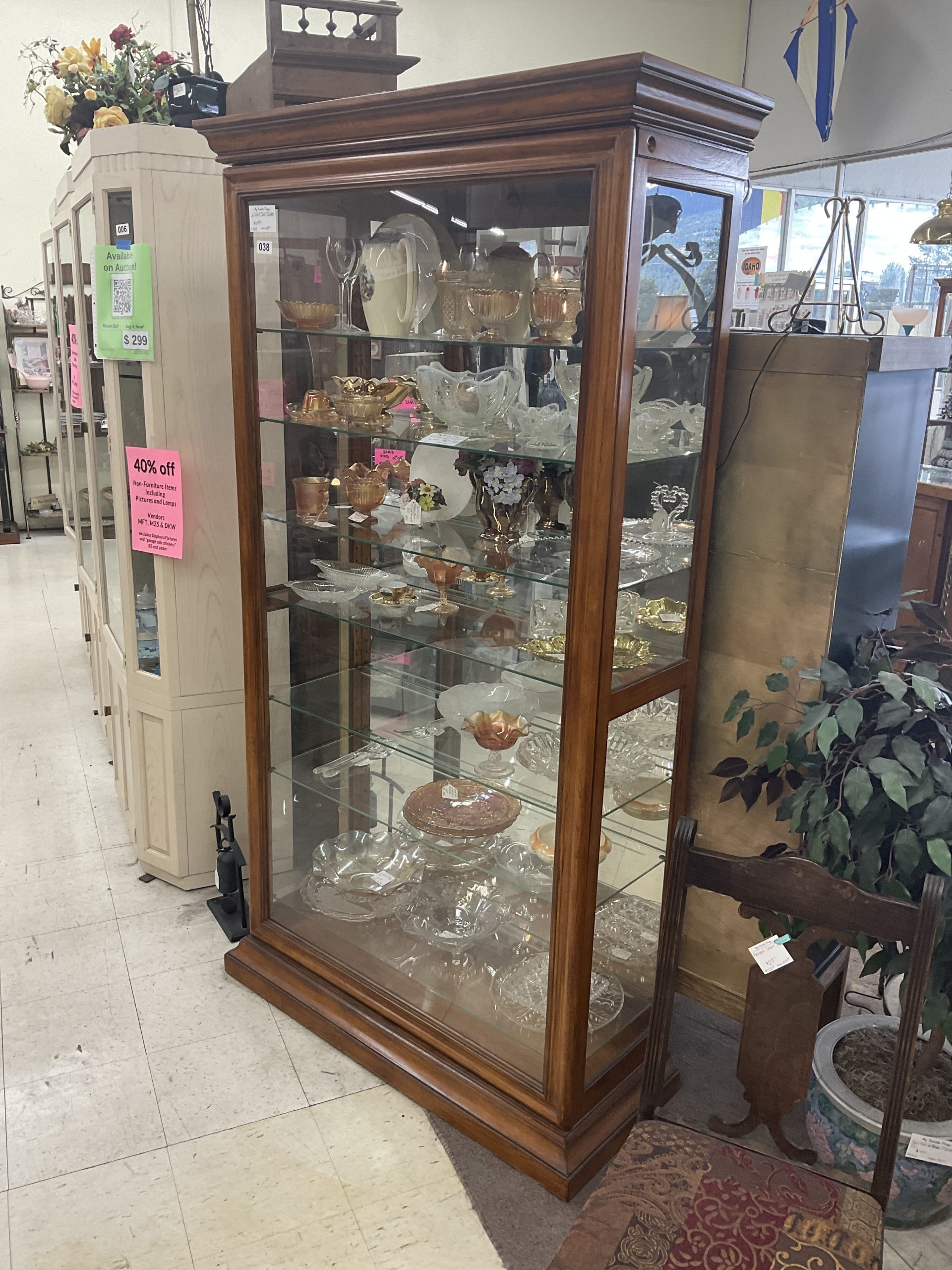 Wood and glass front slide display case. Entry is through front slider. Slides either direction but doesn’t have locks without modification. Seven glass shelves six are adjustable.